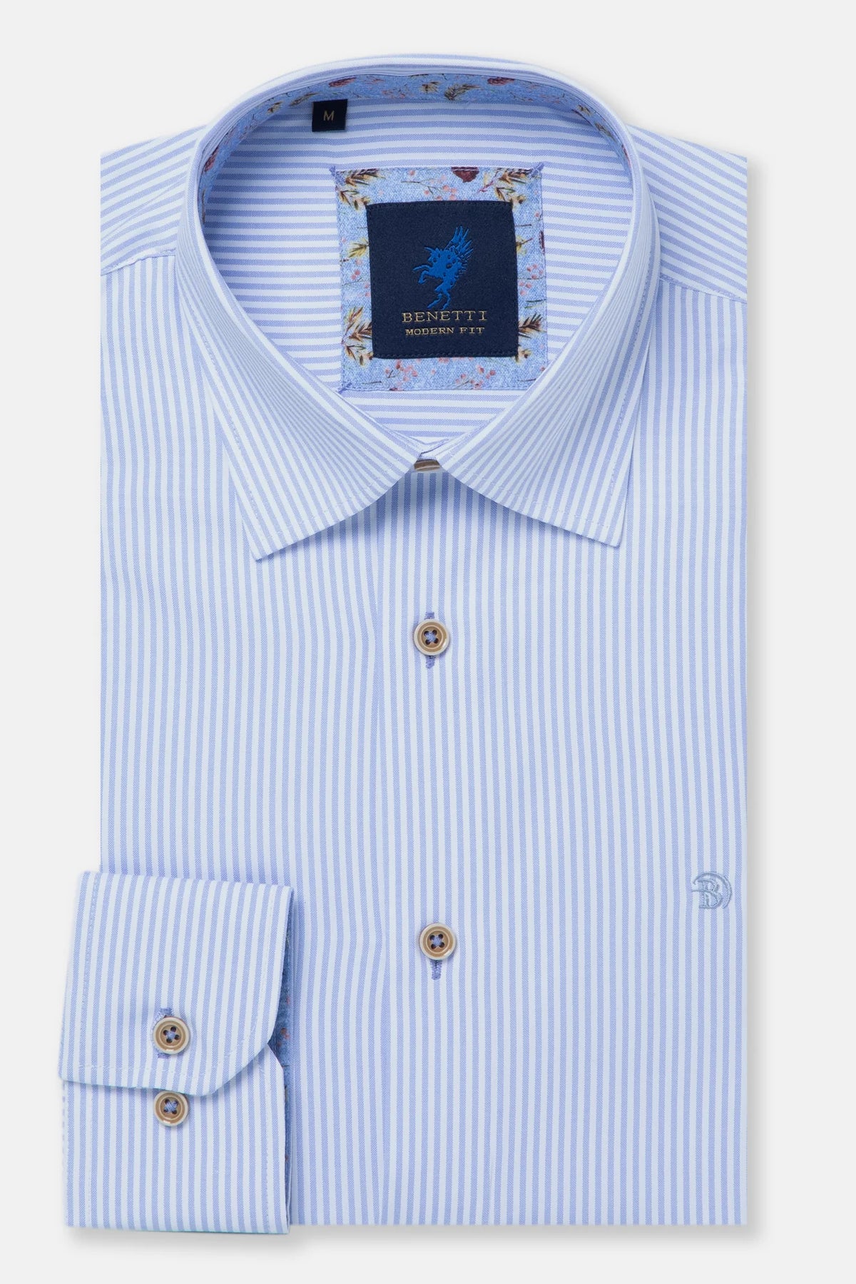 Defined by a fine vertical stripe pattern, the Alexander brings subtle structure and elegance to both formal and smart-casual looks. Cut in Benetti’s Modern Fit, it creates a clean, contemporary silhouette that works seamlessly with tailored trousers, chinos or layered under a blazer.