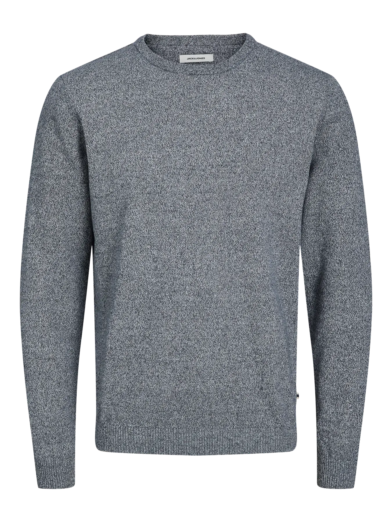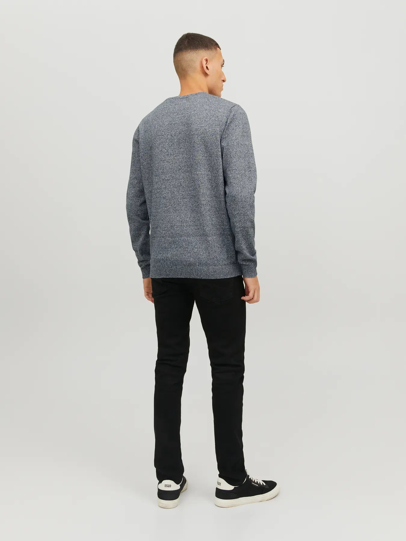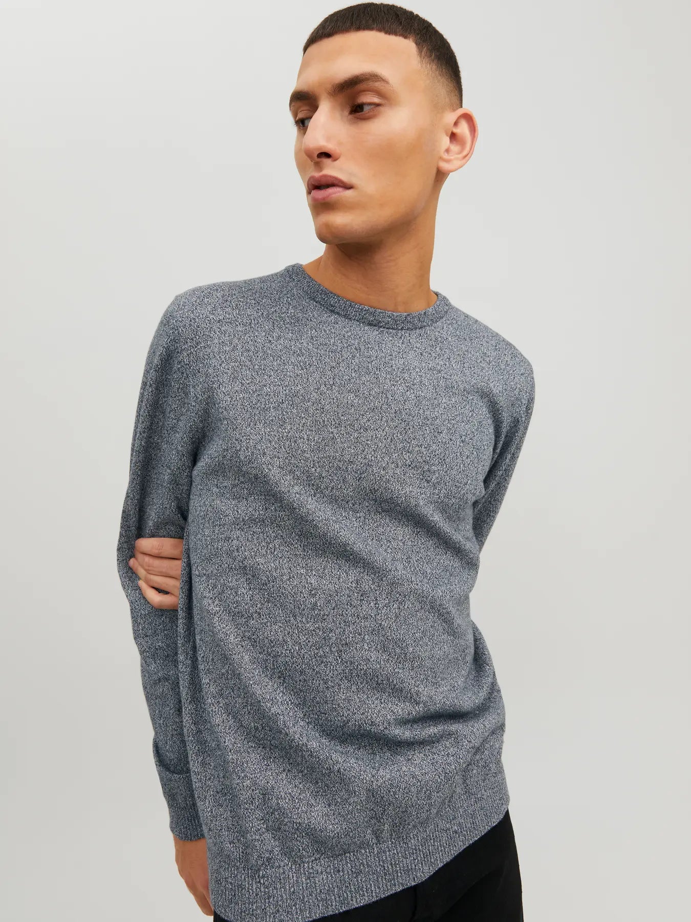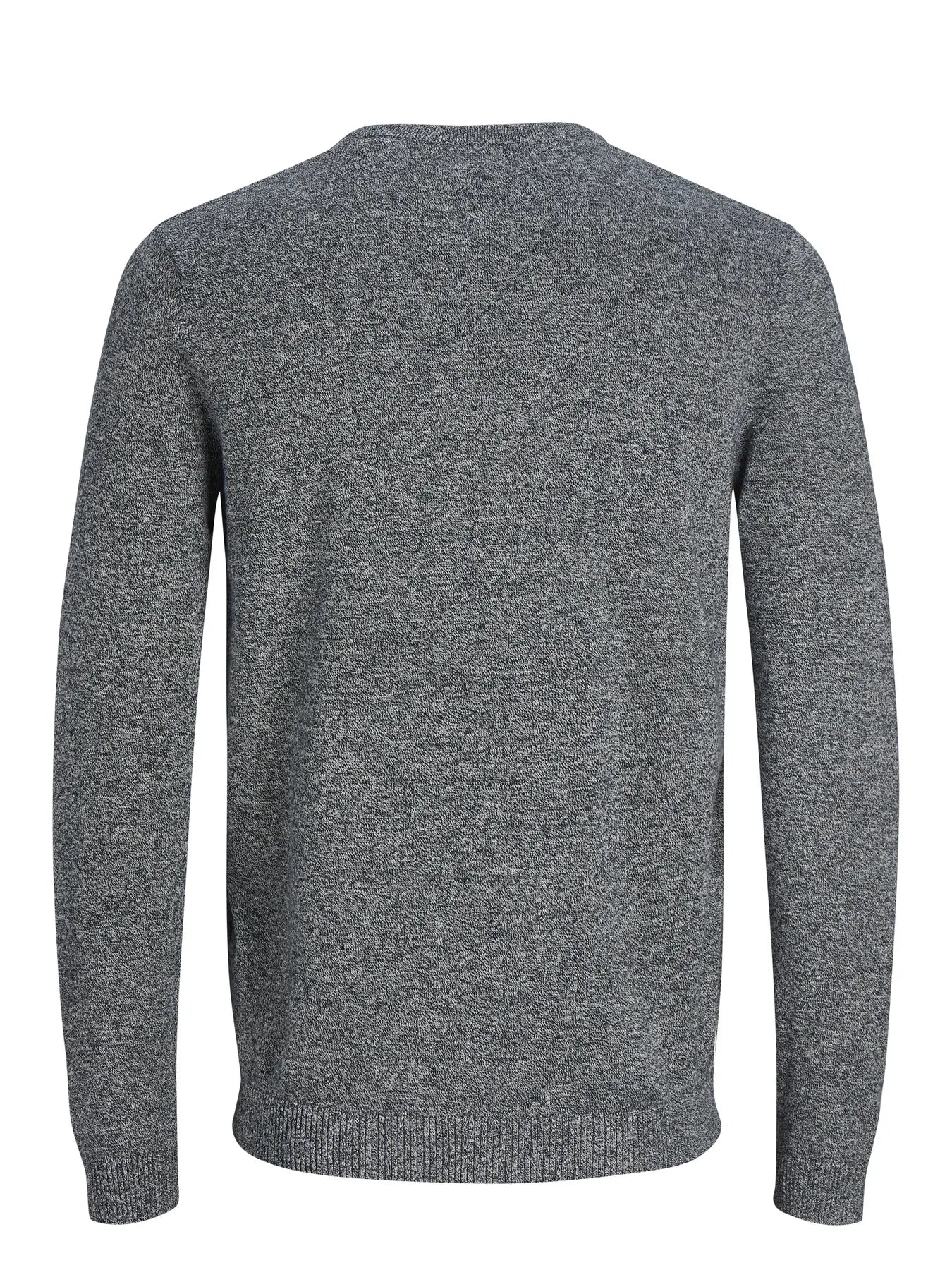 Men's fine knit crew neck jumper from Jack and Jones in dark grey marl. Great for layering with a shirt or tee.