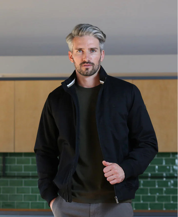 A versatile navy jacket with clean lines and a tailored fit, perfect for layering through transitional seasons.